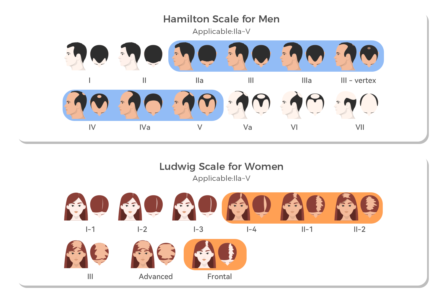 Doctors use the Hamilton Scale for men and the Ludwig Scale for women to assess the severity of hair loss. Below are the images of these scales, with shaded areas indicating the types of hair loss that can be treated with the laser helmet.