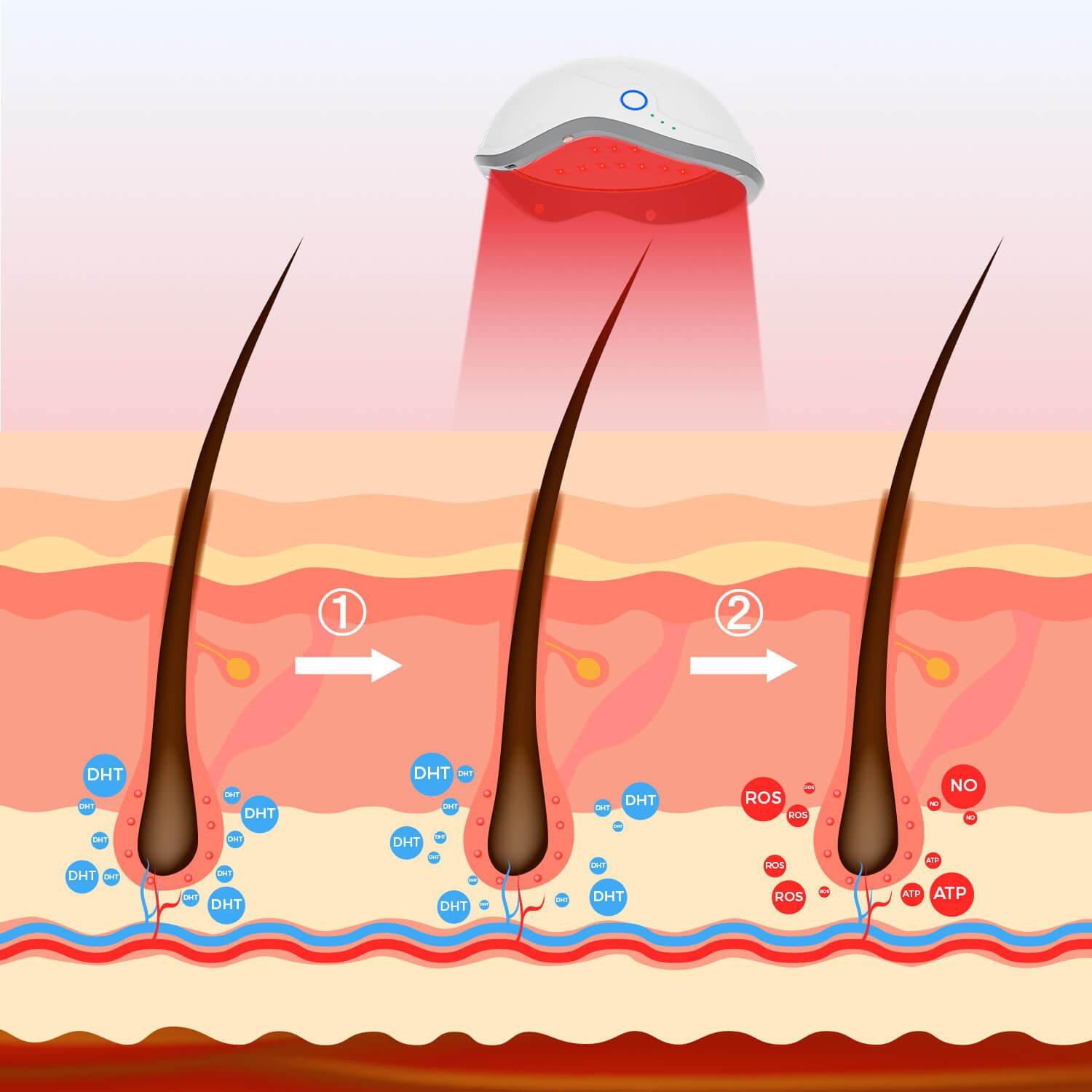 Producing NO, ATP and ROS, which are all vital for hair follicle growth and health.
