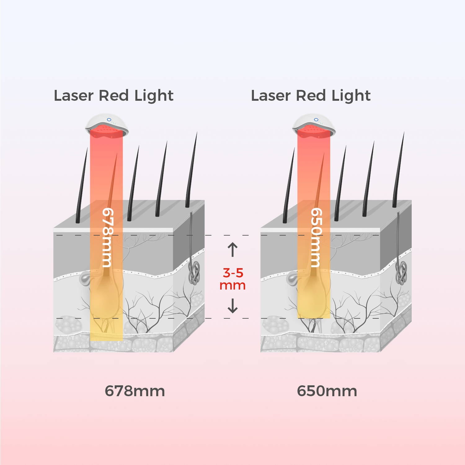 Our laser hair growth helmet features 650nm laser diodes, a proven wavelength for stimulating hair follicles. Unlike other products that use 678nm lasers or LEDs, which lose more energy as they penetrate deeper, 650nm lasers effectively target follicles in the mid-to-upper dermis with optimal energy retention, ensuring better results.